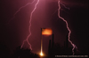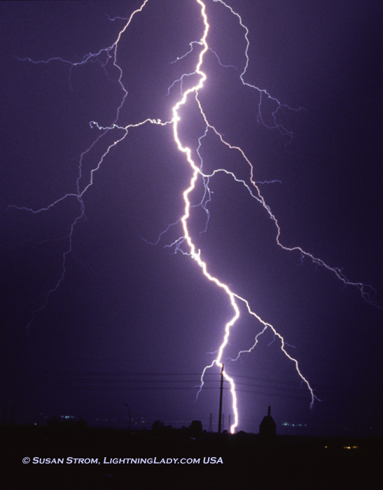 A cloud-to-ground (CG) bolt strikes over high tension wires during a severe