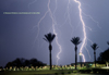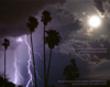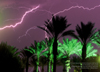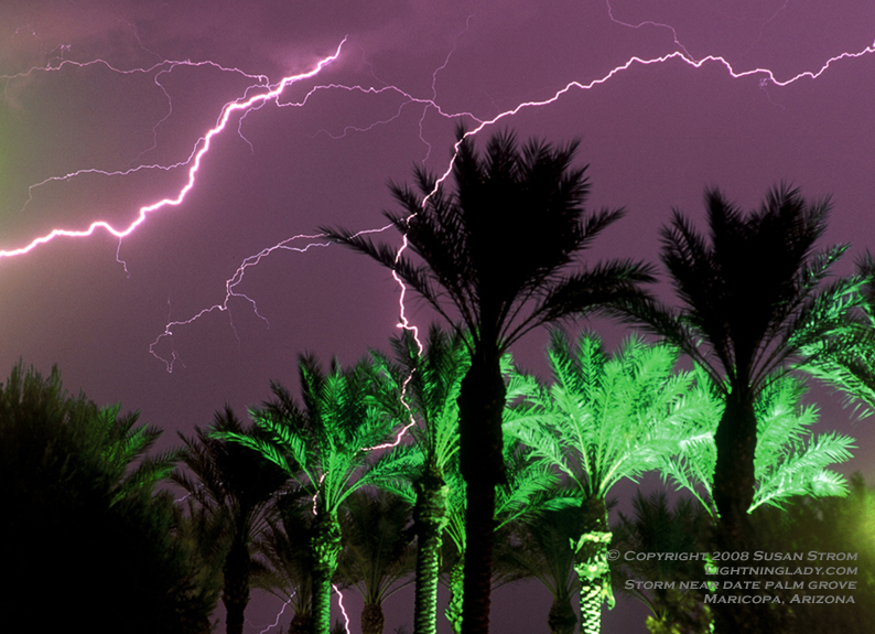 Lightning bolts volley around buildings and date palms in Scottsdale.